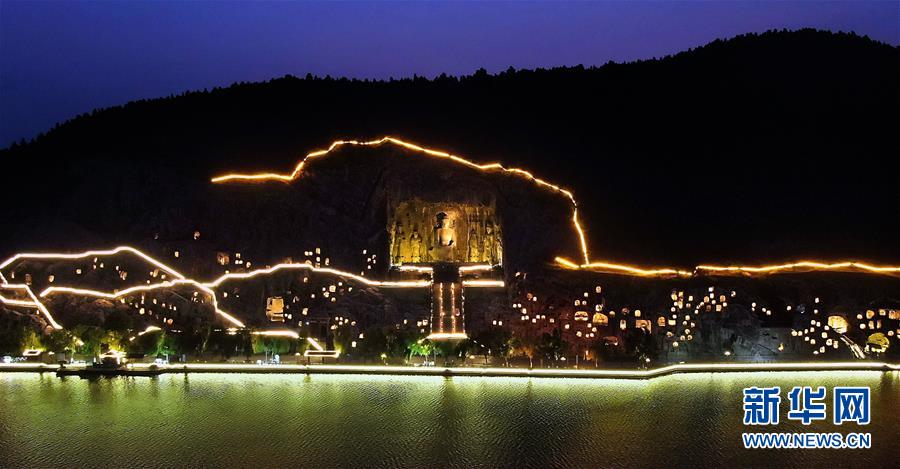 7月7日拍攝的洛陽龍門石窟景區(qū)夜景(無人機照片)。近日,河南洛陽的夜晚愈發(fā)繽紛多彩。立足于厚重的隋唐文化底蘊,洛陽正通過創(chuàng)新夜游產品打響“古都夜八點”品牌,激活文旅消費。新華社記者李安攝