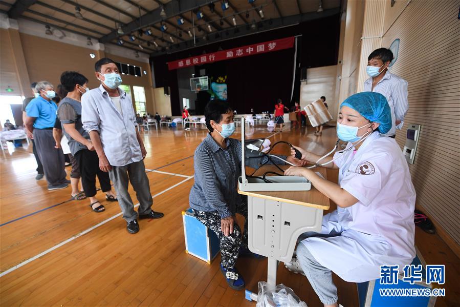 7月8日,在杭州市富陽區(qū)東洲街道安置點東洲中心小學,醫(yī)護人員在給村民測量血壓。新華社記者徐昱攝