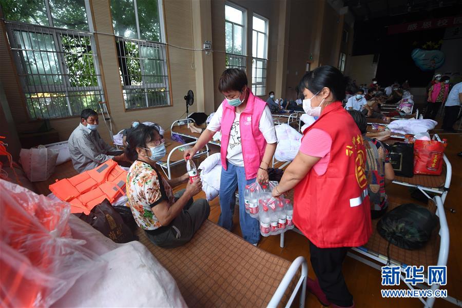 7月8日,在杭州市富陽區(qū)東洲街道安置點東洲中心小學,志愿者向村民發(fā)礦泉水等物資。新華社記者徐昱攝