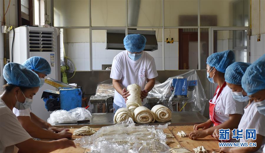 7月8日,張亞釗(中)在車間加工面團。新華社記者韓朝陽攝