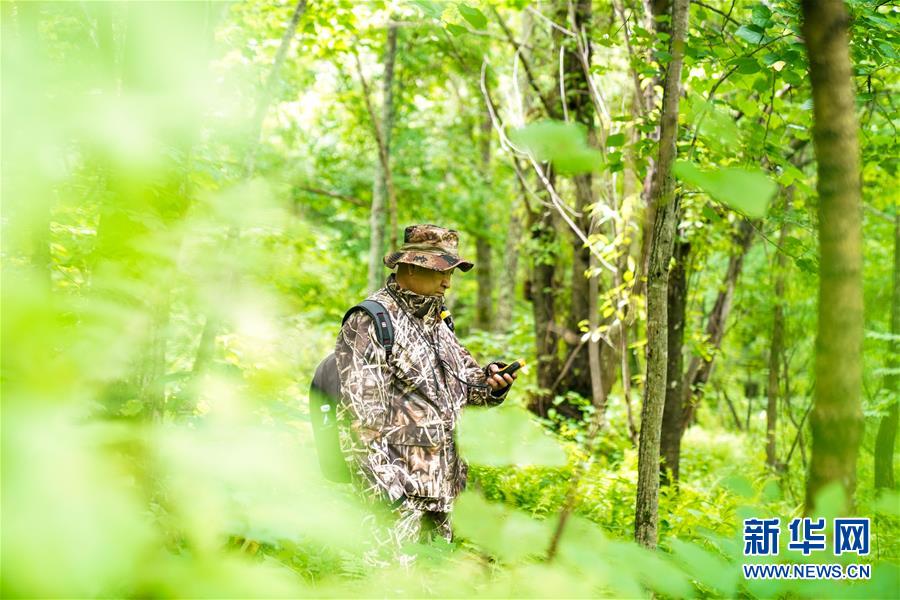 董紅雨在迎春林業(yè)局有限公司施業(yè)區(qū)內(nèi)進(jìn)行野生東北虎信息搜集和巡護(hù)工作(7月8日攝)。新華社記者馬曉成攝