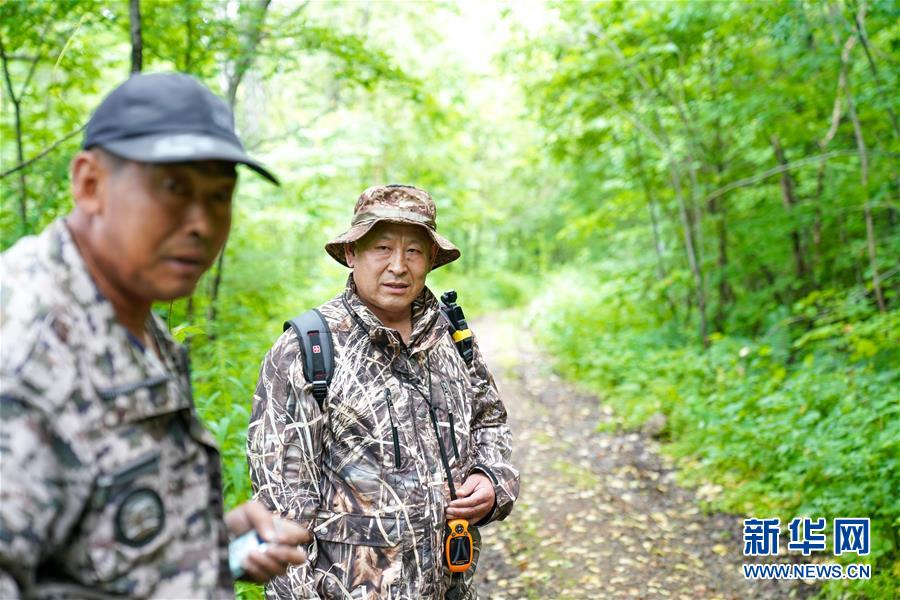 董紅雨(右)在迎春林業(yè)局有限公司施業(yè)區(qū)內(nèi)向當?shù)鼐用袼鸭吧鷸|北虎的蹤跡信息(7月8日攝)。新華社記者馬曉成攝