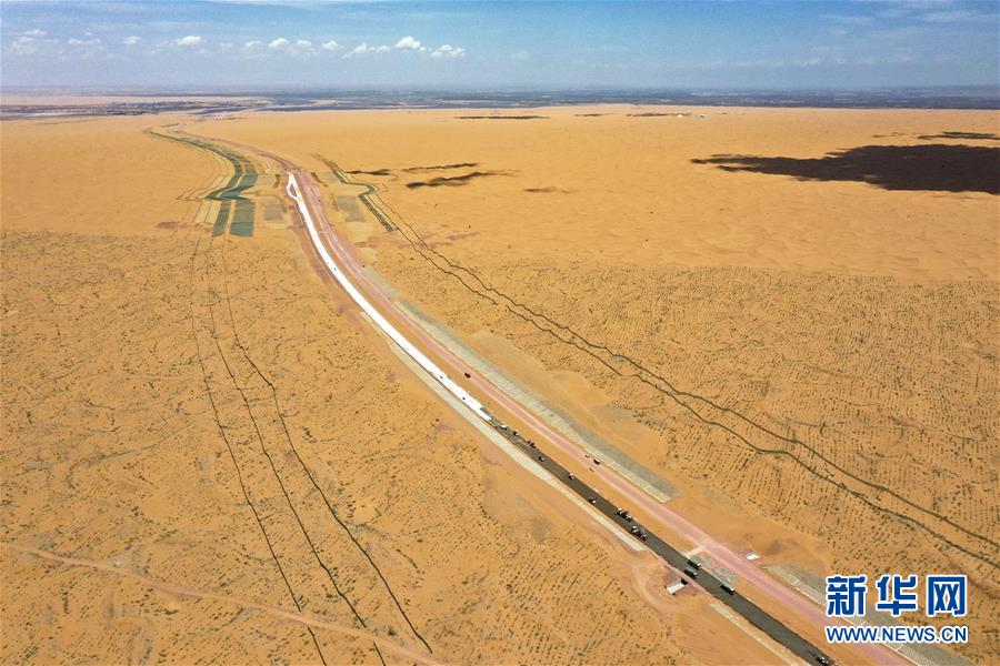 7月10日,位于寧夏境內(nèi)的烏瑪高速青銅峽至中衛(wèi)段A10標(biāo)段在施工中(無(wú)人機(jī)照片)。盛夏時(shí)節(jié),位于寧夏境內(nèi)的烏瑪(內(nèi)蒙古烏海市至青?,斍呖h)高速青銅峽至中衛(wèi)段正在抓緊施工建設(shè)。該路段主線全長(zhǎng)122.9公里,其中穿越騰格里沙漠腹地的18公里公路是寧夏建設(shè)的首條沙漠高速公路,預(yù)計(jì)2021年建成通車。新華社記者馮開華攝。