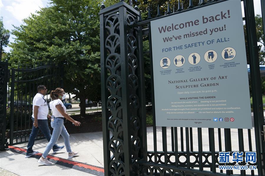 7月11日,人們?cè)诿绹?guó)華盛頓國(guó)家藝術(shù)畫廊雕塑公園游覽時(shí)經(jīng)過(guò)門口關(guān)于疫情防控的告示。新華社記者劉杰攝