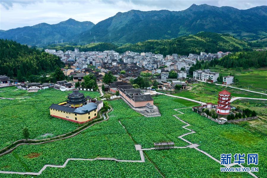 7月3日,浦源村鯉魚溪公園內(nèi)荷花盛開,吸引游人前來(lái)觀賞(無(wú)人機(jī)照片)。新華社記者 姜克紅 攝