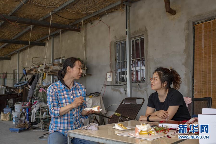 在位于新疆精河縣城的一家糕點店,朱虹美團(tuán)隊在錄制視頻,介紹創(chuàng)意食品——由枸杞果醬、鮮枸杞制作的“枸杞蛋糕”(7月11日攝)。新華社記者 胡虎虎 攝