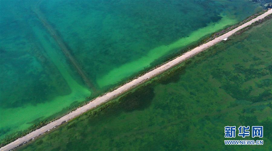 7月10日拍攝的青海湖風(fēng)光(無(wú)人機(jī)照片)。盛夏時(shí)節(jié),被譽(yù)為“中國(guó)最美湖泊”的青海湖畔景色宜人,藍(lán)天、白云、湖水與草原組成一幅壯美的畫(huà)卷。新華社記者 張宏祥 攝