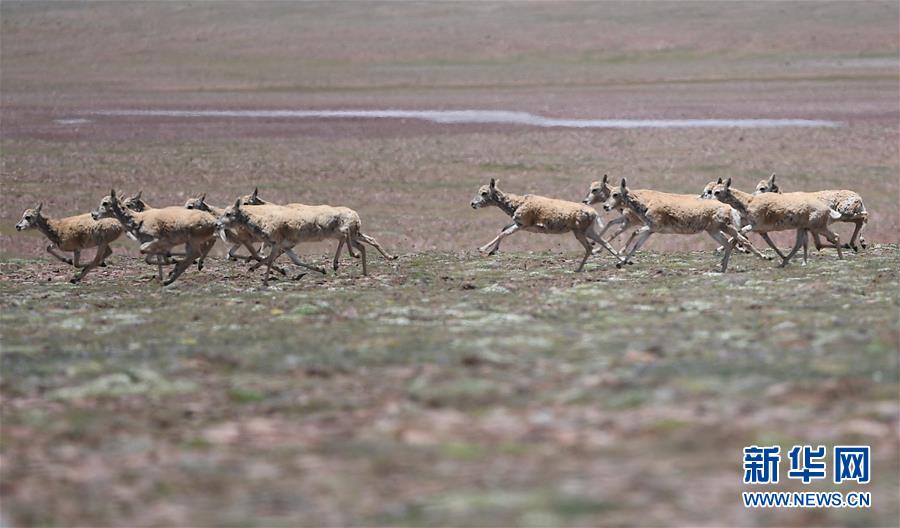 7月7日在可可西里卓乃湖區(qū)域拍攝的一群藏羚羊。目前正值藏羚羊產(chǎn)仔季。來自青海三江源、新疆阿爾金山、西藏羌塘等地的藏羚羊來到位于青海省可可西里腹地、被譽為“藏羚羊大產(chǎn)房”的卓乃湖區(qū)域產(chǎn)仔。新華社記者 張龍 攝
