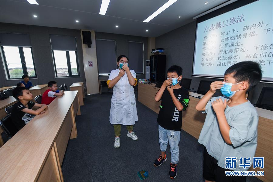 7月16日,小學生在東林鎮(zhèn)衛(wèi)生院醫(yī)護人員的示范和講解下學習正確佩戴口罩。當日,浙江省湖州市吳興區(qū)東林鎮(zhèn)舉辦暑期“安全防護小超人”主題活動?;顒佑舍t(yī)護人員、消防隊員等為學生及家長講授日常安全避險及溺水急救知識,中小學們還在現(xiàn)場學習了簡易包扎、心肺復蘇的正確方式,并了解滅火器、滅火毯等消防器材的使用,為學生平安過暑期打好安全防護“預防針”。新華社記者 徐昱 攝