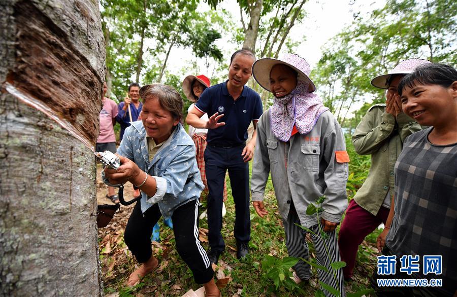 7月15日,中國熱帶農(nóng)業(yè)科學(xué)院橡膠研究所曹建華研究員向瓊中縣什運鄉(xiāng)便文村貧困戶介紹電動割膠刀使用方法。當(dāng)日,海南瓊中黎族苗族自治縣什運鄉(xiāng)為542名貧困戶免費發(fā)放電動割膠刀,割膠刀研發(fā)單位為貧困戶提供使用技能培訓(xùn)。海南有著豐富的天然橡膠資源,但傳統(tǒng)膠刀的割膠技術(shù)要求高,農(nóng)民難以掌握,許多膠林閑置。電動割膠刀使割膠簡單易學(xué),幫助村民提高割膠效率,助力脫貧增收。新華社記者郭程攝