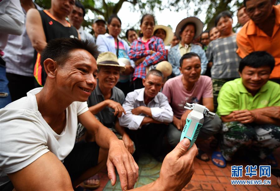 7月15日,瓊中縣什運鄉(xiāng)便文村村民在了解電動割膠刀的構(gòu)造。當(dāng)日,海南瓊中黎族苗族自治縣什運鄉(xiāng)為542名貧困戶免費發(fā)放電動割膠刀,割膠刀研發(fā)單位為貧困戶提供使用技能培訓(xùn)。海南有著豐富的天然橡膠資源,但傳統(tǒng)膠刀的割膠技術(shù)要求高,農(nóng)民難以掌握,許多膠林閑置。電動割膠刀使割膠簡單易學(xué),幫助村民提高割膠效率,助力脫貧增收。新華社記者郭程攝