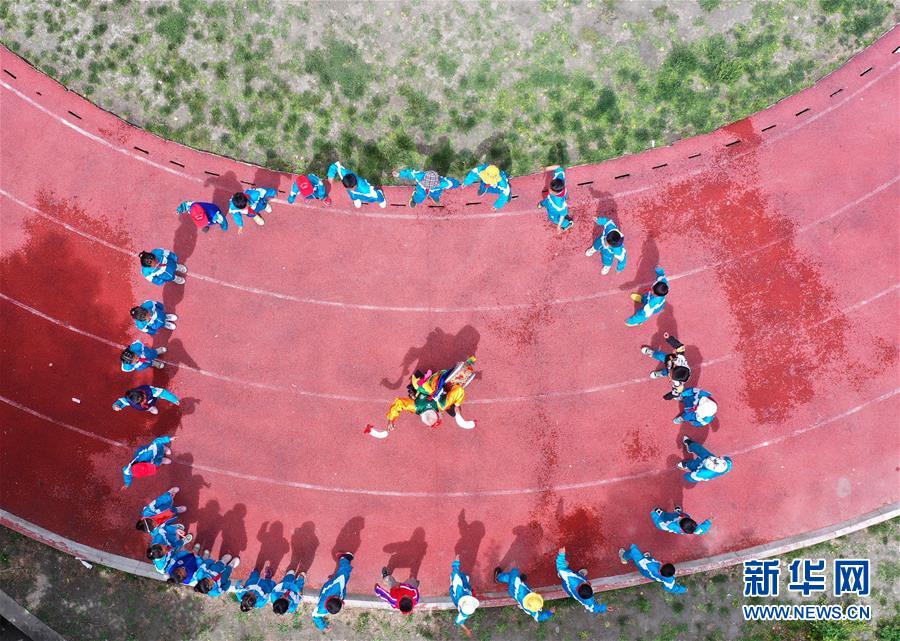 “久河卓舞”傳承人尼瑪在瓊結(jié)縣下水鄉(xiāng)小學進行教學表演(7月2日攝,無人機照片)。新華社記者詹彥攝
