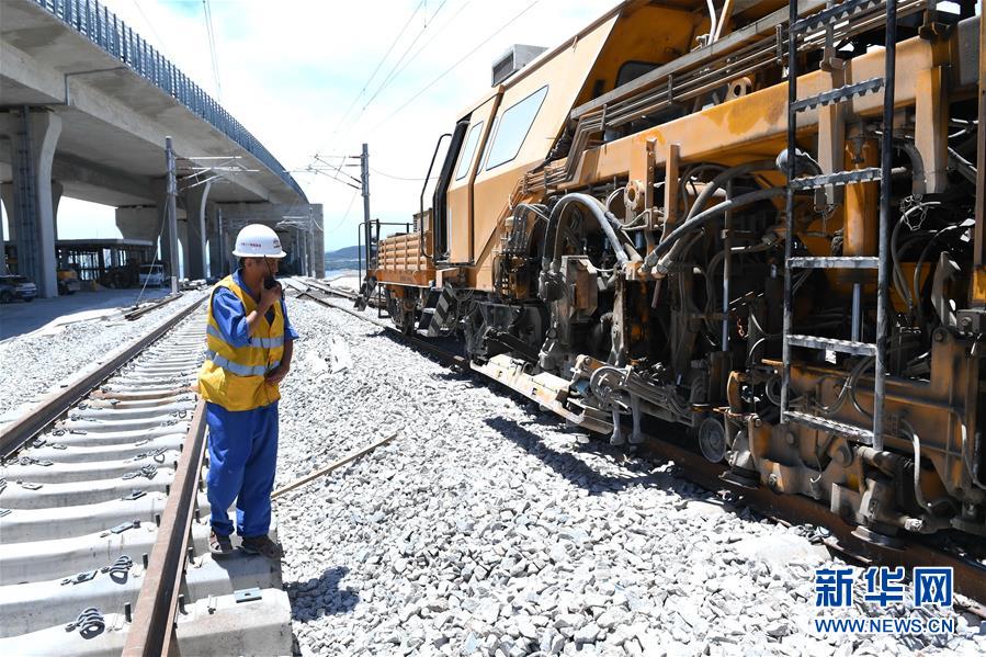 7月20日,中鐵二十四局施工人員進(jìn)行平潭海峽公鐵大橋最后一根500米長(zhǎng)軌的換鋪工作。當(dāng)日,中鐵二十四局施工人員在平潭海峽公鐵大橋進(jìn)行最后一根鐵路長(zhǎng)軌換鋪。至此,平潭海峽公鐵大橋雙線鐵路長(zhǎng)軌全部換鋪完成。新華社記者林善傳攝