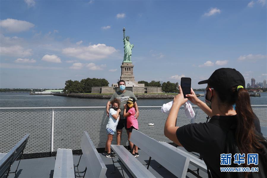 7月20日,參觀者在美國(guó)紐約前往自由島的游艇上拍照留念。美國(guó)紐約市20日繼續(xù)推進(jìn)經(jīng)濟(jì)重啟計(jì)劃,宣布開始進(jìn)入解封新階段,進(jìn)一步允許部分低風(fēng)險(xiǎn)文娛活動(dòng)重啟。自由女神像所在的自由島對(duì)公眾開放,但雕像內(nèi)部和博物館仍關(guān)閉。新華社記者王迎攝