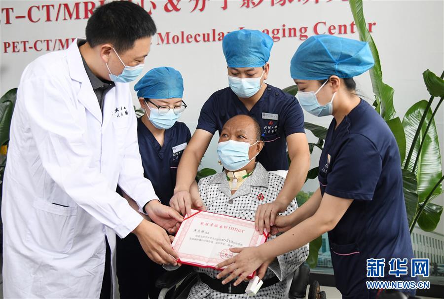7月21日,國家衛(wèi)健委醫(yī)政醫(yī)管局醫(yī)療質量與評價處副處長馬旭東(左一)為崔先生頒發(fā)了編號為“5510”的“戰(zhàn)勝者證書”。新華社記者程敏攝