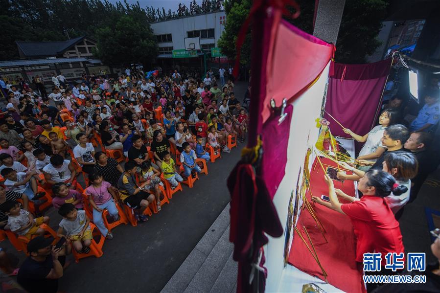 7月21日,和睦橋村的村民們在文化禮堂觀看皮影戲表演。新華社記者徐昱攝