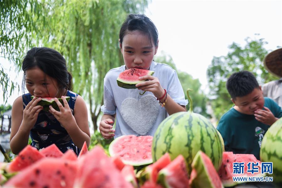 7月22日,廟兜村的孩子們在比賽吃西瓜。當(dāng)日是大暑節(jié)氣,浙江省湖州市吳興區(qū)織里鎮(zhèn)廟兜村舉行了趣味“賽西瓜”比賽,迎接這個“火熱”的節(jié)氣。廟兜村種植有500多畝西瓜,目前正值西瓜豐收的時節(jié),村民們用“賽西瓜”的形式,感受豐收的喜悅。新華社記者徐昱攝