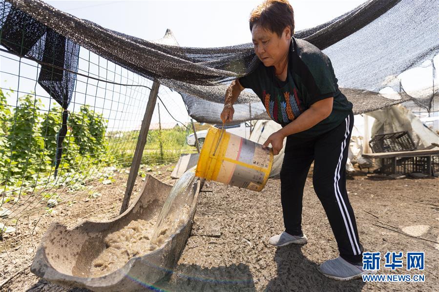 7月23日,在黑龍江省撫遠市濃橋鎮(zhèn)東方紅村,康麗艷在給鴨和鵝準(zhǔn)備飲用水。新華社記者 謝劍飛 攝