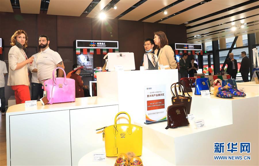 2020年5月8日,虹橋品匯國別文化節(jié)云游意大利主題展在上海虹橋進口商品展示交易中心舉行,參觀者從展覽上一個意大利皮具展示臺前走過。新華社記者 方喆 攝