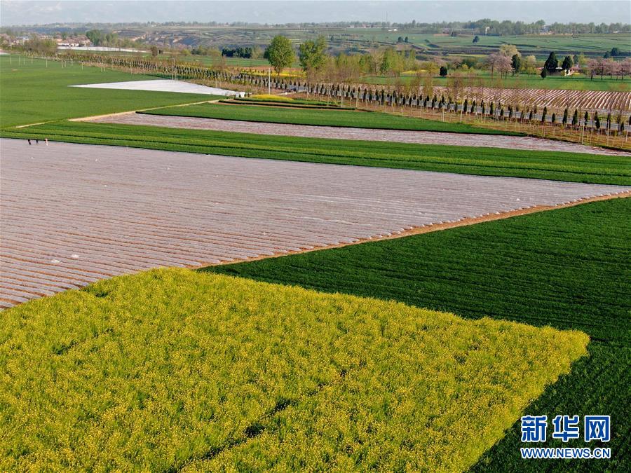 這是洛陽市洛寧縣小界鄉(xiāng)一處油菜、西瓜、小麥間種的農(nóng)田(4月13日攝,無人機照片)。新華社記者 李安 攝