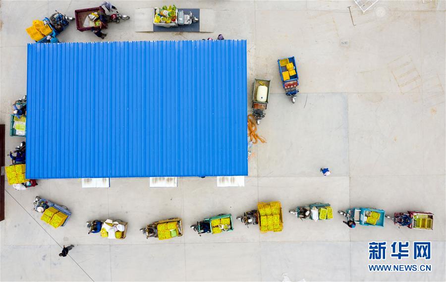 在寧夏紅寺堡區(qū)柳泉鄉(xiāng)柳泉村黃花菜晾曬場,村民排隊稱重黃花菜(7月11日攝,無人機(jī)照片)。新華社記者 楊植森 攝