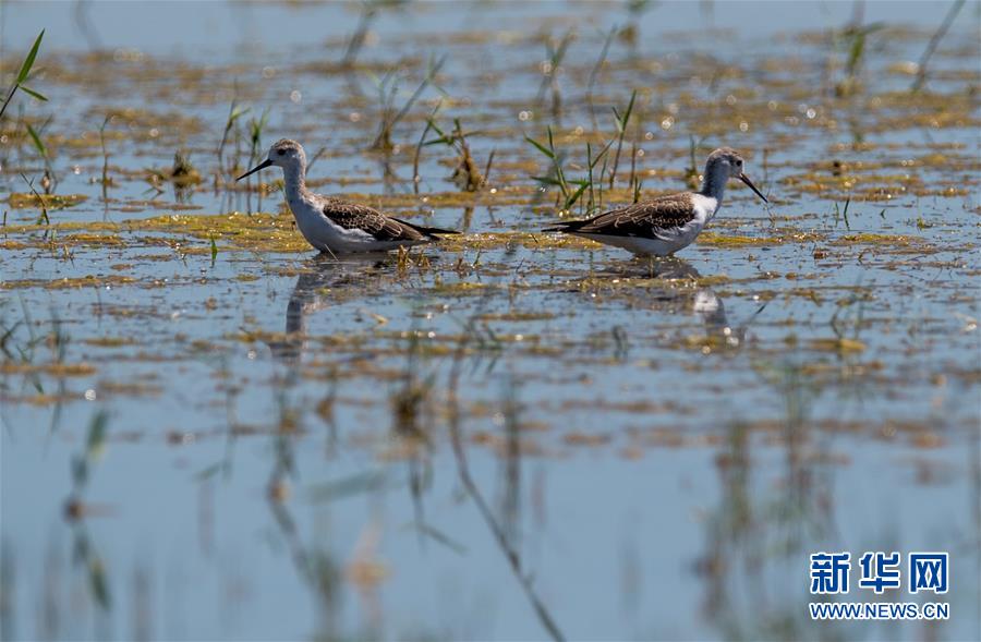 7月28日,兩只長腳鷸在桃力廟—阿拉善灣海子覓食。鄂爾多斯?jié)竦匚挥趲觳箭R沙漠、毛烏素沙地接壤地帶,2002年被列入國際重要濕地名錄。從2006年開始,由于濕地湖面萎縮、湖心島消失,在此筑巢繁殖的世界瀕危物種遺鷗幾近消失。近年來,當(dāng)?shù)夭扇《喾N治理措施,濕地生態(tài)環(huán)境逐步好轉(zhuǎn)。2019年起,濕地內(nèi)的桃力廟—阿拉善灣海子迎來遺鷗大規(guī)?!盎貧w”。如今,40多種鳥類在此棲息,鄂爾多斯?jié)竦刂匦鲁蔀轼B類的樂園。新華社記者連振攝
