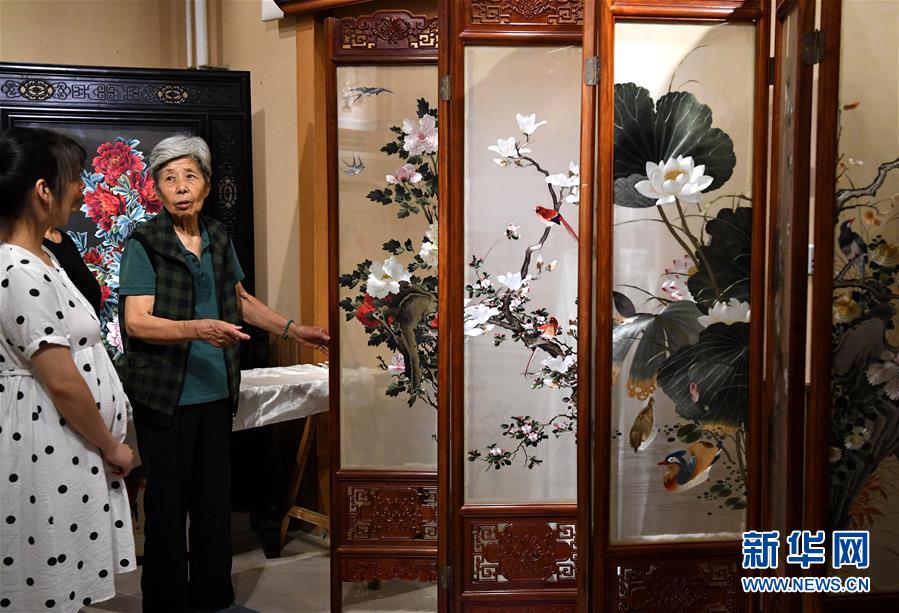 在開封市素花宋繡工藝有限公司的展示館里,王素花向徒弟劉冬紅講解刺繡作品上的難點(diǎn)(7月30日攝)。新華社記者李安攝
