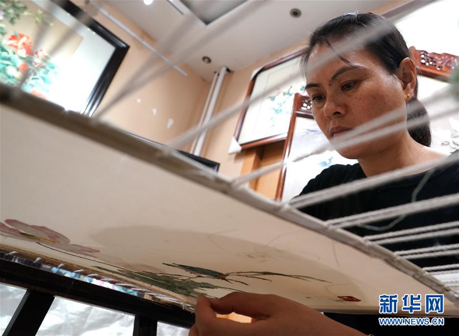 在開封市素花宋繡工藝有限公司的展示館里,王素花的徒弟劉冬紅在刺繡(7月30日攝)。新華社記者李安攝
