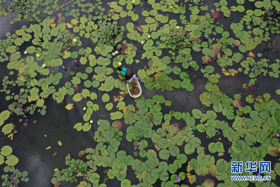 8月4日,藝溯家生態(tài)農(nóng)場工作人員在池塘采摘香水蓮花(無人機(jī)照片)。近年來,位于浙江湖州吳興區(qū)八里店鎮(zhèn)移沿山村的藝溯家生態(tài)農(nóng)場,在約45畝的傳統(tǒng)水產(chǎn)養(yǎng)殖池塘上規(guī)?;N植香水蓮花,既凈化水質(zhì),又提高了經(jīng)濟(jì)效益。農(nóng)場還設(shè)計出種植、采摘和加工香水蓮花的工藝流程,以面向更多農(nóng)戶推廣。新華社記者黃宗治攝