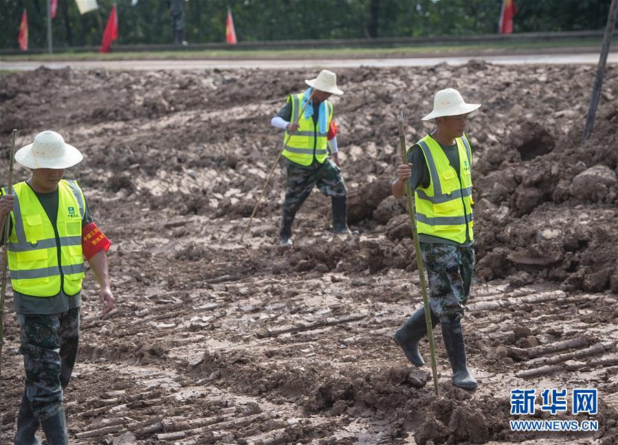 8月5日,夏德勤(左一)與同事在長(zhǎng)江武金堤背水面巡查管涌情況。新華社記者肖藝九攝