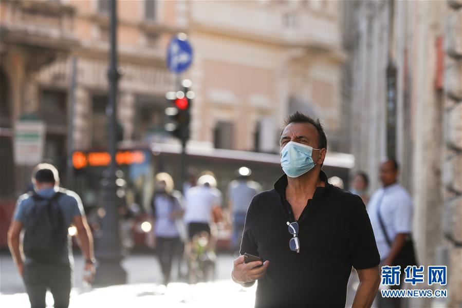 8月4日,一名男子戴著口罩走在意大利首都羅馬街頭。受新冠疫情影響,今年夏天羅馬的歷史中心區(qū)游客比往年明顯減少。新華社記者程婷婷攝