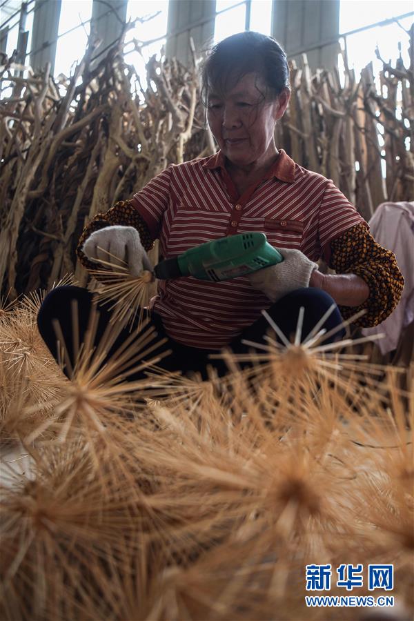 8月7日,工人利用柑橘樹枝加工吊燈飾品。2017年以來,廣西桂林市永福縣永安鄉(xiāng)通過幫扶返鄉(xiāng)青年創(chuàng)業(yè)的方式,建立起根雕工藝品就業(yè)扶貧車間,組織貧困群眾進車間務(wù)工學(xué)藝,把當(dāng)?shù)刎S富的朽木和柑橘樹根枝資源利用起來,加工成盆景、茶桌、吊燈等根雕工藝品,不僅幫助貧困群眾在家門口掌握一技之長,還讓他們在脫貧摘帽后實現(xiàn)穩(wěn)定增收。新華社記者張愛林攝