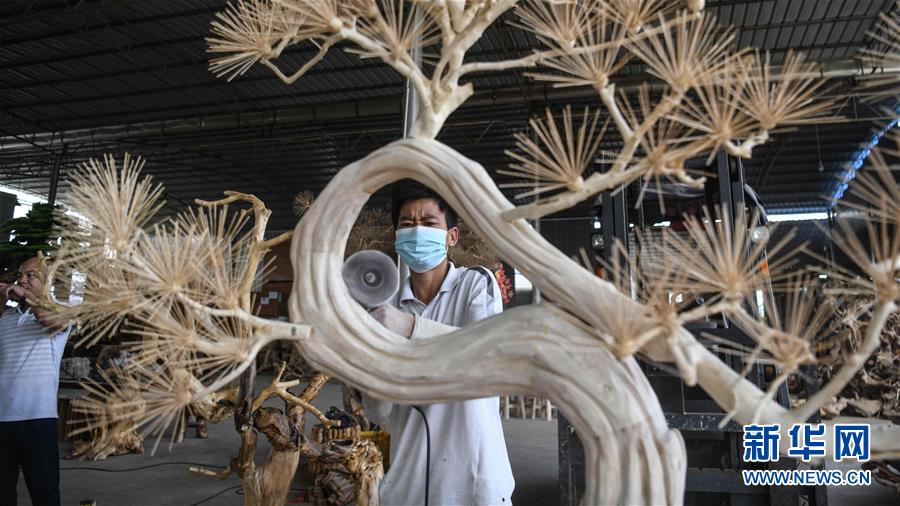 8月7日,工人在制作根雕工藝品。2017年以來,廣西桂林市永??h永安鄉(xiāng)通過幫扶返鄉(xiāng)青年創(chuàng)業(yè)的方式,建立起根雕工藝品就業(yè)扶貧車間,組織貧困群眾進(jìn)車間務(wù)工學(xué)藝,把當(dāng)?shù)刎S富的朽木和柑橘樹根枝資源利用起來,加工成盆景、茶桌、吊燈等根雕工藝品,不僅幫助貧困群眾在家門口掌握一技之長,還讓他們?cè)诿撠氄焙髮?shí)現(xiàn)穩(wěn)定增收。新華社記者張愛林?jǐn)z