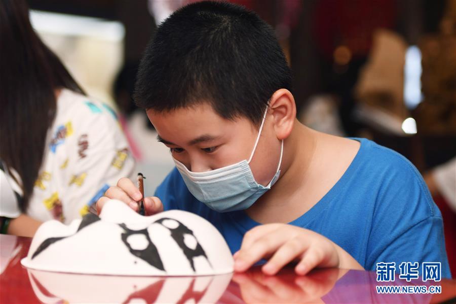 8月8日,小朋友在長沙市非物質(zhì)文化遺產(chǎn)展示館體驗湘劇臉譜繪制。暑假期間,許多小朋友來到位于湖南省長沙市橘子洲景區(qū)的長沙市非物質(zhì)文化遺產(chǎn)展示館參觀體驗。新華社記者 薛宇舸 攝