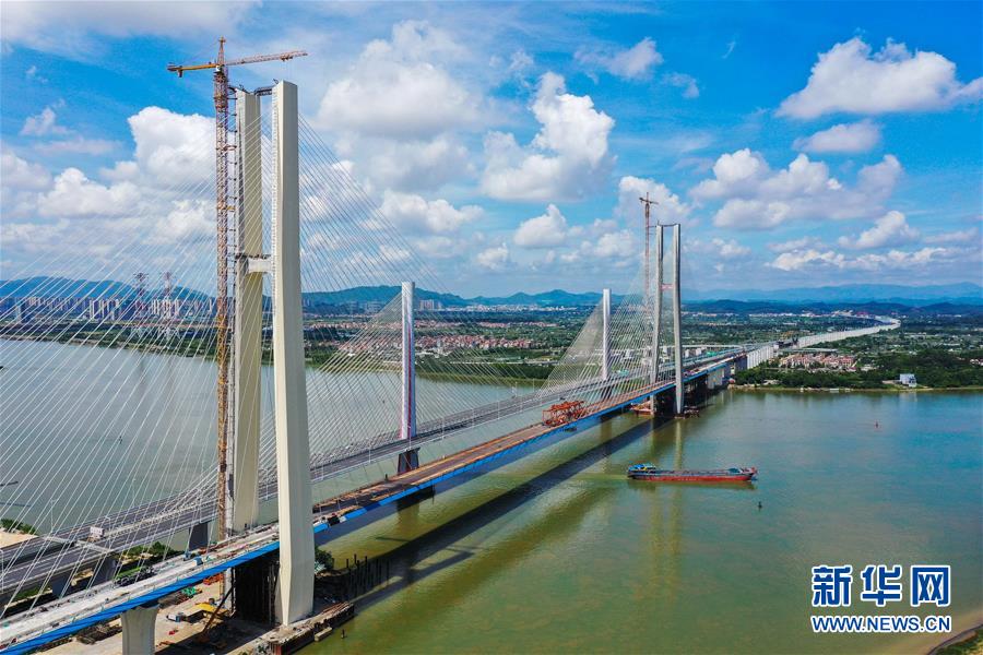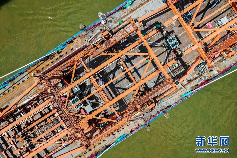 8月9日拍攝的廣州南沙港鐵路跨西江特大斜拉橋最后一塊鋼箱梁吊裝施工現(xiàn)場(chǎng)(無(wú)人機(jī)照片)。當(dāng)日,中鐵十一局承建的粵港澳大灣區(qū)基礎(chǔ)設(shè)施“硬聯(lián)通”重點(diǎn)工程——廣州南沙港鐵路跨西江特大斜拉橋完成最后一塊鋼箱梁吊裝作業(yè),大橋即將合龍。該橋位于廣東佛山市和江門市交界處,全長(zhǎng)1117.5米。新華社記者劉大偉攝。