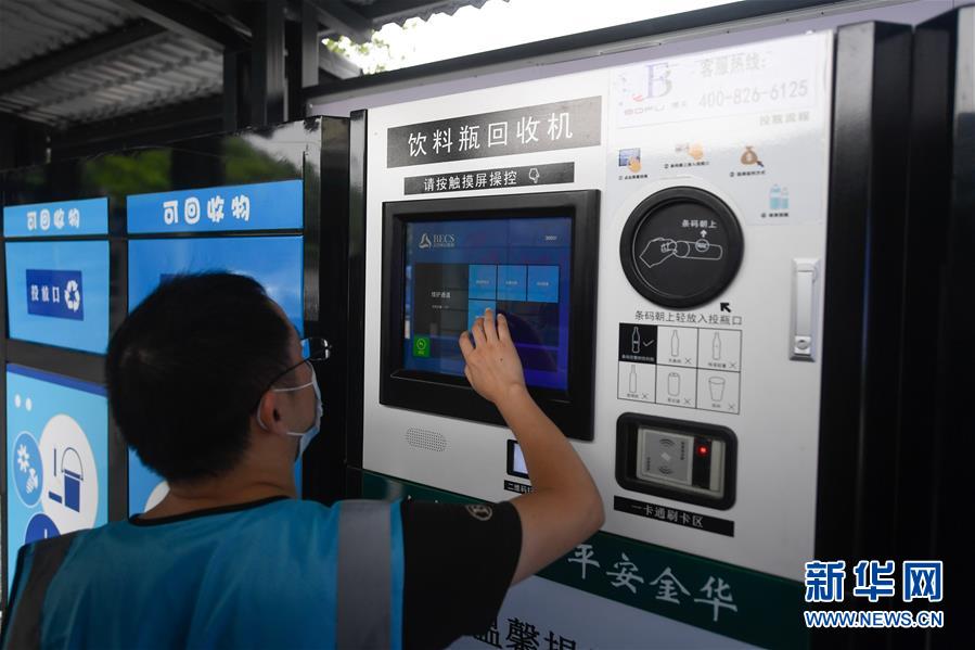 網(wǎng)格員在金華市金東區(qū)東孝街道一處垃圾分類投放點(diǎn)操作飲料瓶回收機(jī)(7月16日攝)。近年來(lái),浙江省通過(guò)創(chuàng)新宣傳教育,多措并舉促進(jìn)垃圾分類投放、收運(yùn)及處置的良性循環(huán),引領(lǐng)垃圾分類成為城鄉(xiāng)居民的生活新風(fēng)尚。新華社記者黃宗治攝。