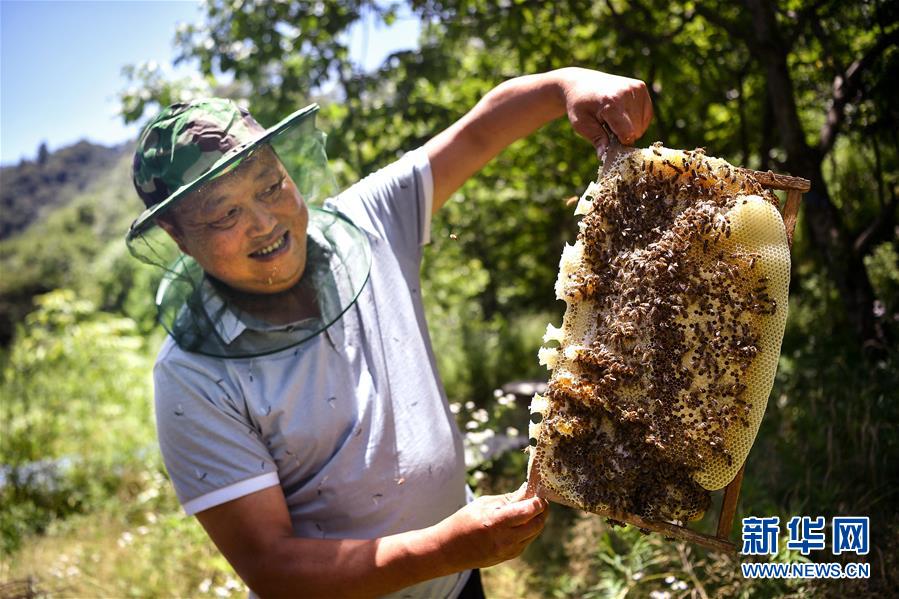 陜西漢中市留壩縣火燒店鎮(zhèn)天星亮村村民在展示扶貧社養(yǎng)殖的蜜蜂(7月2日攝)。秦嶺生態(tài)資源豐富,具有得天獨(dú)厚的蜜蜂養(yǎng)殖條件,但多年來(lái)山區(qū)農(nóng)戶自產(chǎn)自銷的模式收益甚少。近年來(lái),多地采取“農(nóng)戶+合作社”模式,讓山區(qū)群眾養(yǎng)蜂增收有了保障。新華社記者劉瀟攝。