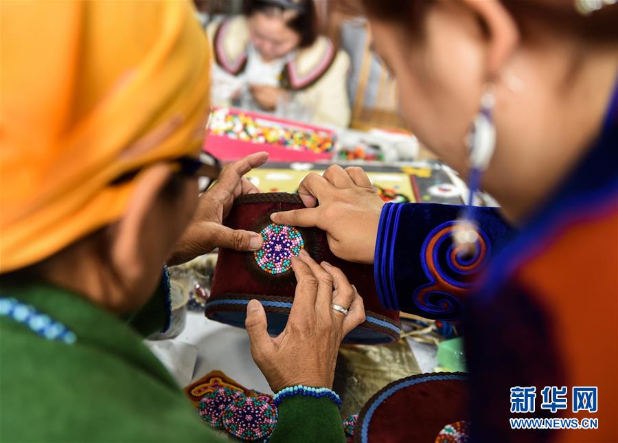 在內(nèi)蒙古自治區(qū)鄂溫克族自治旗巴彥托海鎮(zhèn)太陽花傳承發(fā)展中心,脫貧戶敖登圖雅(左)向烏仁交付自己制作好的手工藝品(8月6日攝)。新華社記者徐欽攝。
