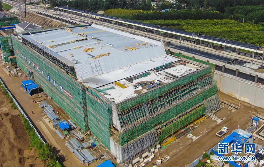 8月10日拍攝的建設(shè)中的京雄城際鐵路霸州北站(無(wú)人機(jī)照片)。京雄城際鐵路霸州北站站臺(tái)雨棚混凝土結(jié)構(gòu)施工日前全部完成,目前霸州北站已全面轉(zhuǎn)入裝飾裝修和機(jī)電安裝階段,預(yù)計(jì)2020年底投入使用。京雄城際鐵路是連接北京市區(qū)、大興機(jī)場(chǎng)和雄安新區(qū)的重要干線。建成后,將進(jìn)一步完善京津冀區(qū)域高速鐵路網(wǎng)結(jié)構(gòu),便利沿線群眾出行,對(duì)于推動(dòng)京津冀協(xié)同發(fā)展和支撐建設(shè)雄安新區(qū)具有重要意義。新華社記者李曉果攝。