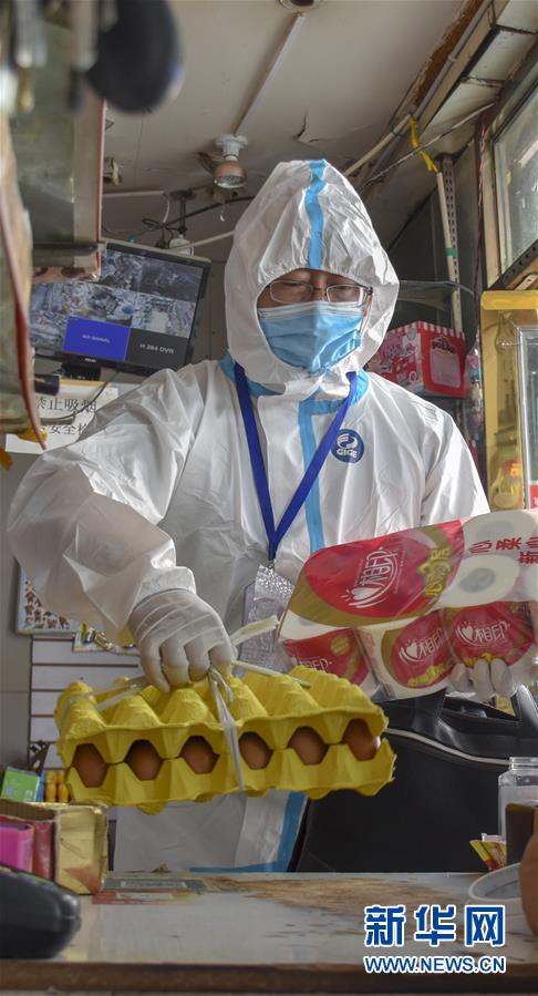8月12日,烏魯木齊市天山區(qū)山西巷社區(qū)工作人員王志鷹幫居民代購生活用品。新華社記者 高晗 攝