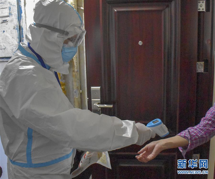 8月12日,烏魯木齊市天山區(qū)山西巷社區(qū)工作人員王志鷹(左)上門為居家居民測量體溫。新華社記者 高晗