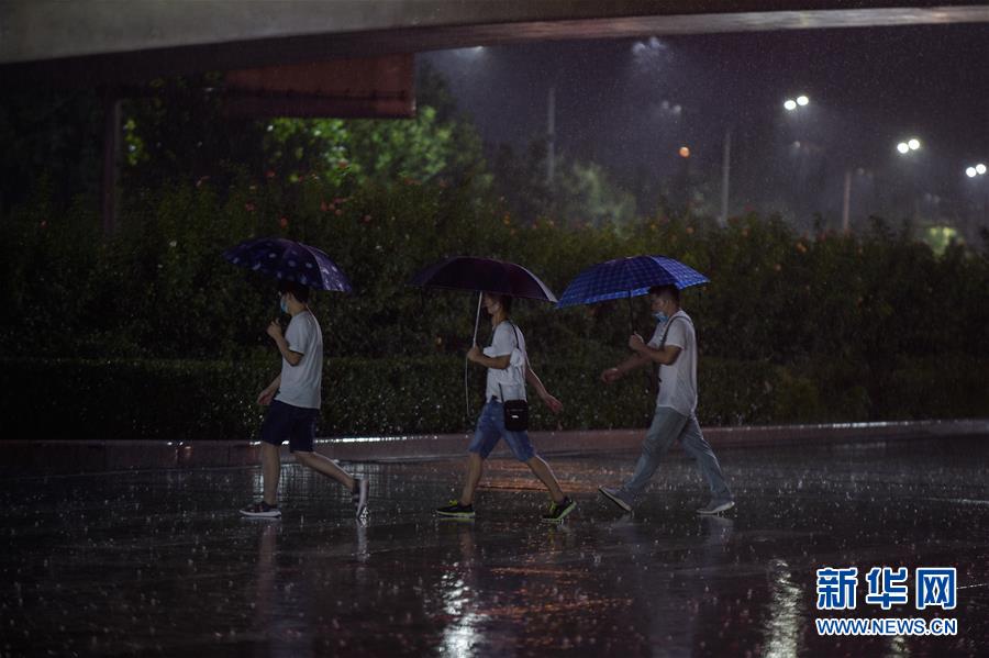 8月12日,在北京市朝陽區(qū)一路段,行人冒雨出行。新華社記者 鞠煥宗 攝