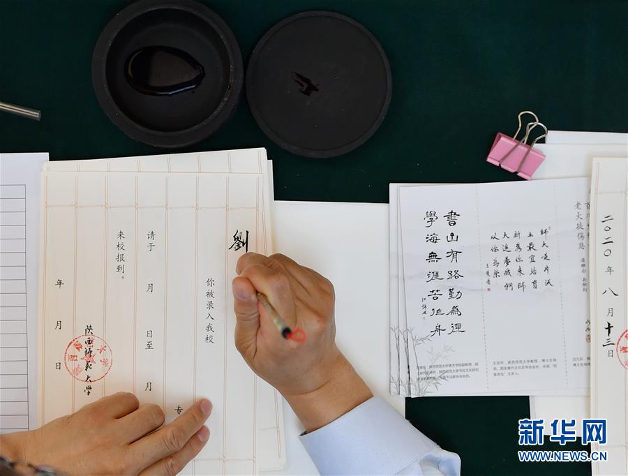 8月13日,陜西師范大學(xué)退休教師符有堂書寫錄取通知書。當(dāng)日,陜西師范大學(xué)2020年手寫錄取通知書正式開(kāi)筆。該校自2007年起采用毛筆書寫錄取通知書的方式,為新生傳遞佳音。今年,學(xué)校十余位退休教師、在職教師、校友代表等書法愛(ài)好者將為約4500名新錄取的本科生送上帶著墨香的大學(xué)錄取通知書。新華社記者張博文攝