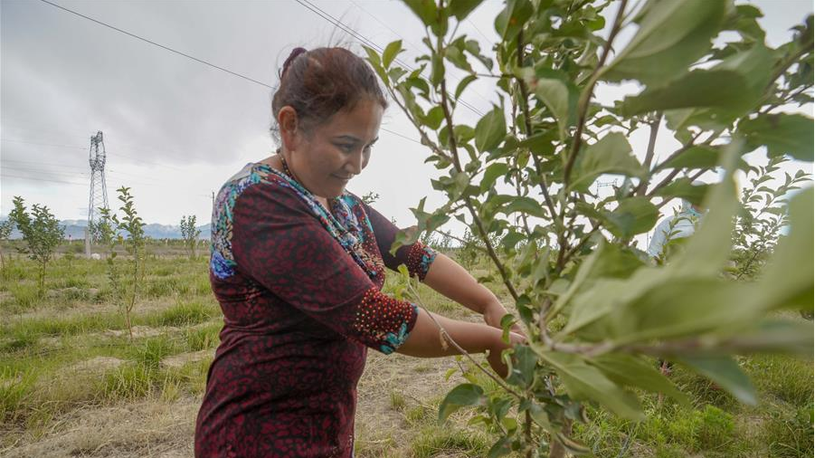 在新疆察布查爾錫伯自治縣一處生態(tài)扶貧林,當(dāng)?shù)刎毨?hù)將修剪完的樹(shù)枝拉回家喂牲畜(6月16日攝)。