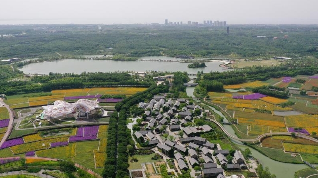 江蘇宿遷三臺(tái)山森林公園鮮花競(jìng)相開放,空中俯瞰,好似鋪撒在大地上的五彩畫卷。