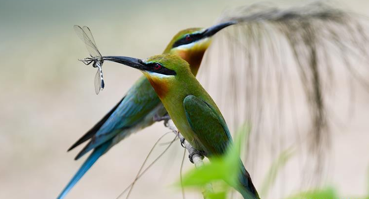 近日,不少栗喉蜂虎來到海南省??谑兄卜敝常瑩?jù)??诋z榃濕地研究所工作人員統(tǒng)計,目前來到??诘睦鹾矸浠⒁延薪?00只。