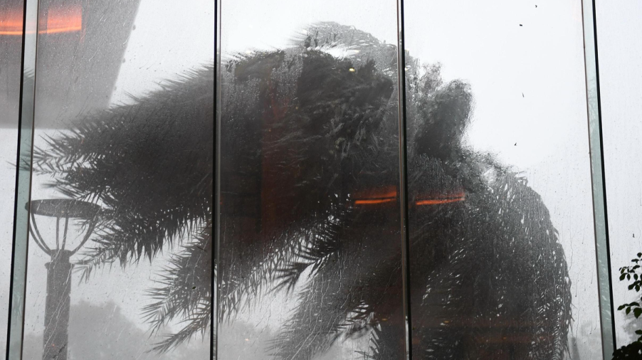 2020年8月4日,浙江樂清一酒店的景觀樹在臺風中大幅搖動。