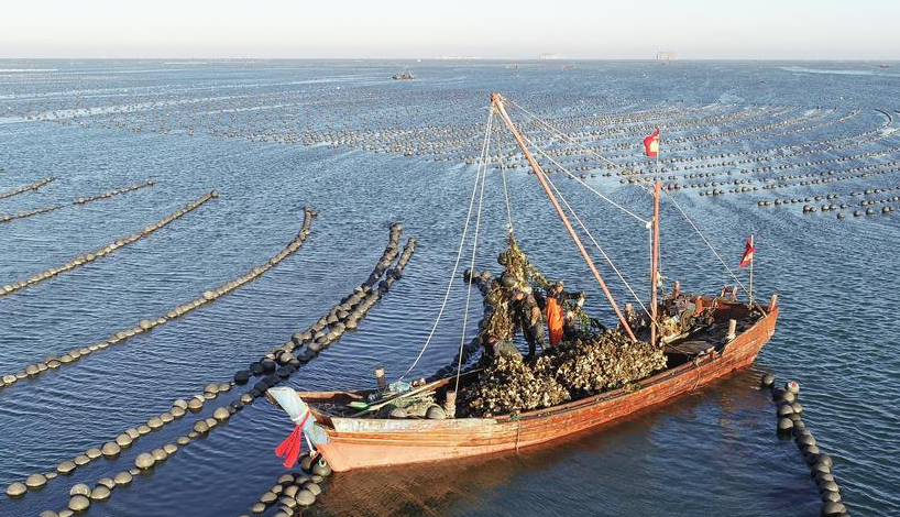 當日,在遼寧省大連市長??h廣鹿島海域,漁民忙碌地打撈牡蠣,呈現(xiàn)一片繁忙的豐收景象。