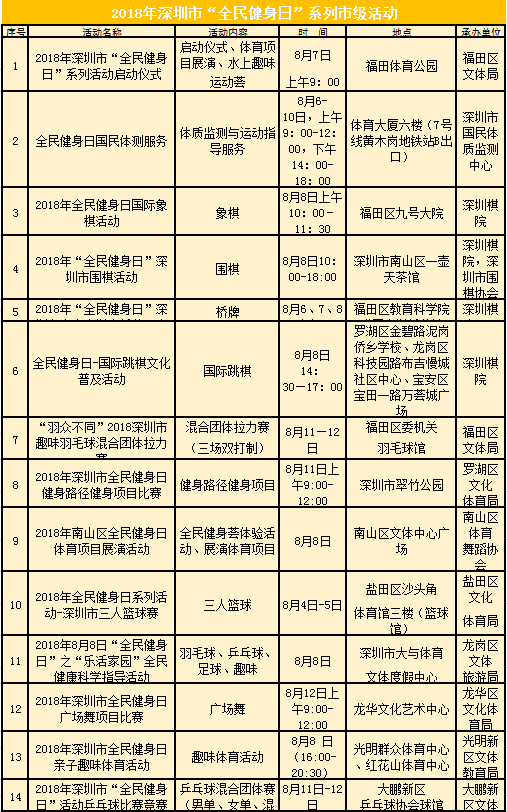 其中,市文體旅游局將于8月7日,在福田體育公園舉辦全民健身日啟動(dòng)儀式,屆時(shí)將有體育項(xiàng)目展演、水上趣味運(yùn)動(dòng)薈等項(xiàng)目上演。此外,全市還將組織舉辦適合不同人群的“全民健身活動(dòng)展示”、“全民健身嘉年華”活動(dòng),如全民健身科普宣傳、咨詢輔導(dǎo)、項(xiàng)目推廣、交流展示以及比賽等;面向全市市民舉辦大型國(guó)民體質(zhì)監(jiān)測(cè)、健身咨詢、大講堂等科學(xué)健身指導(dǎo)活動(dòng);引導(dǎo)和動(dòng)員各級(jí)社會(huì)體育指導(dǎo)員開(kāi)展義務(wù)健身輔導(dǎo),利用豐富的體育專業(yè)技術(shù)知識(shí),深入開(kāi)展全民健身志愿服務(wù)活動(dòng),免費(fèi)向市民開(kāi)放市屬公共體育場(chǎng)館(深圳體育館、深圳游泳跳水館、深圳網(wǎng)球中心、深圳體育場(chǎng)等四家體育場(chǎng)館)等。