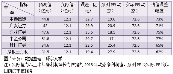 舜宇光學(xué)的市值為998億港元,僅為騰訊的3%,騰訊波動(dòng)一個(gè)點(diǎn)的市值,就相當(dāng)于舜宇光學(xué)波動(dòng)33.3%,肯定比不了。不過以打臉的程度來(lái)說,舜宇光學(xué)有點(diǎn)過了,預(yù)測(cè)值與實(shí)際值的估值誤差達(dá)70%左右,這臉打的確實(shí)響。